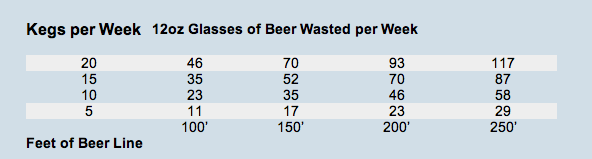 | Stop Pouring Profit down the Drain | For example: (Use the chart above to calculate the result) An establishment without FOBs installed dispenses 20 kegs per week, through a system that has a 100-foot beer draw. The beer needed to purge and refill the lines would equal approximately 46 12 oz. glasses. Multiply the number of glasses by the profit per glass. Lets say at $1.00 per glass, this would equal $46.00 dollars per week wasted. As you can see from the example; FOBs installed in a long draw system will reduce your waste and increase your profits. An FOB will pay for itself in only 6 kegs. Make the investment and install FOBs in your long draw beer system. Stop pouring profits down the drain. |
